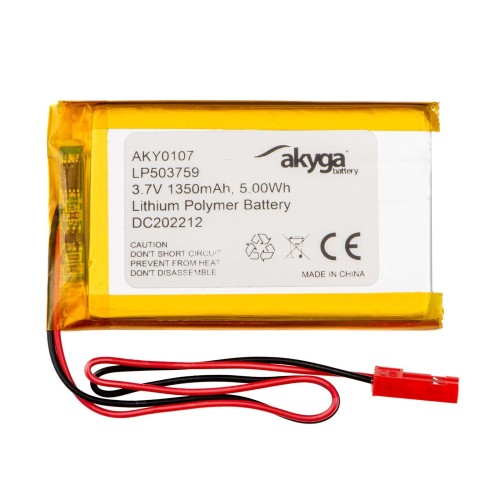 Az Akyga akkumulátor lítium polimer akkumulátorával bevált és biztonságos megoldást kap. Az AKY0107 akkumulátor kiváló minőségű védelmi rendszerrel rendelkezik, amely megóvja az akkumulátort a túltöltéstől, a túlzott kisüléstől és a rövidzárlattól. Kapacitása 1350 mAh, névleges feszültsége 3,7 V. Az akkumulátor beszerelésének megkönnyítése érdekében két 150 mm hosszú kábelt készítettünk, amelyek JST 2 tűs csatlakozóval vannak lezárva.Az akkumulátor megfelel az MSDS, CE, RoHS tanúsítványoknak.Mielőtt lítium-polimer elemeket használna, ismerkedjen meg a használati szabályokkal. A helytelen használat kárt okozhat ezekben.